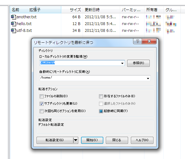 2012-11-08 WinSCPのミラーリングアップロードでWindowsで編集したファイルをさくらVPSに自動的に送信する コンテキスト Windowsでファイル編集するのに慣れている。 問題 さくらVPS (CentOS) でたくさんのファイルを編集したい。 解決 WinSCPのミラーリングアップロードを使う。 これで、Windowsのローカルディレクトリで編集したファイルを自動的にさくらVPS側のリモートディレクトリに転送してくれる。 詳細 WinSCPを起動する。 メニューから、コマンド→ミラーリングアップロードを選ぶ。 ダイアログで監視するローカルディレクトリとリモートディレクトリを選ぶ。 参考 Windowsの秀丸でさくらVPS上のファイルをリモートで編集する方法 さまざまな方法を教えてくださったフォロワーさん方に感謝します。